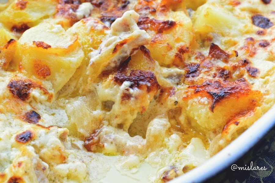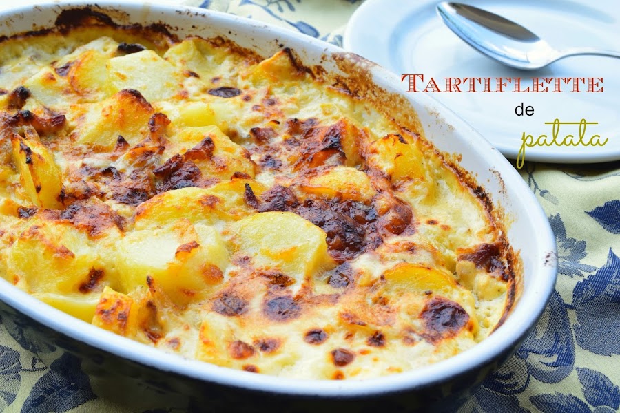 Los ingredientes para prepararla son: queso, patatas cocidas, cebolla, beicon, nata (crema de leche), pimienta y vino blanco y se sirve todo junto gratinado.