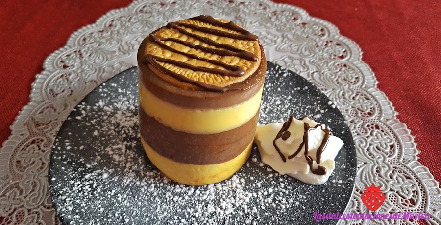 Hacemos otra capa de flan solo como la primera. Reservamos unas poquitas de natillas que nos van ha servir para la ultima capa. Como habrán espesado, le añadimos un chorreoncito de leche y ponemos al fuego, movemos bien y le ponemos unos 20 gr de chocolate en polvo, mezclando todo muy bien, y lo mismo cuando arranque a hervir apartamos y ponemos encima de la ultima capa junto con la galleta.