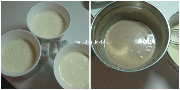 Calentar la leche, nata (crema de leche), yemas y el azúcar, antes que hierva retirar del fuego y añadir las hojas de gelatina, colar.
