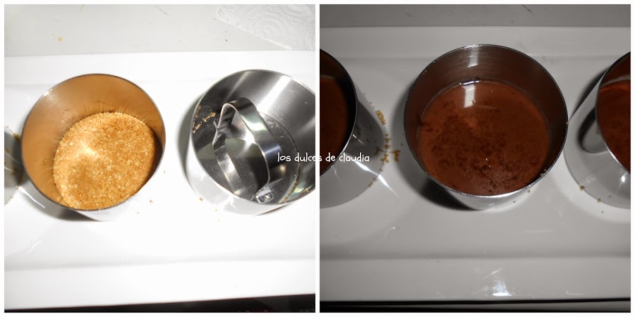 Poner en cada molde galleta, y luego las capas de chocolate. (siempre cuelo la mezcla). Entre capa y capa llevar al frigorífico.