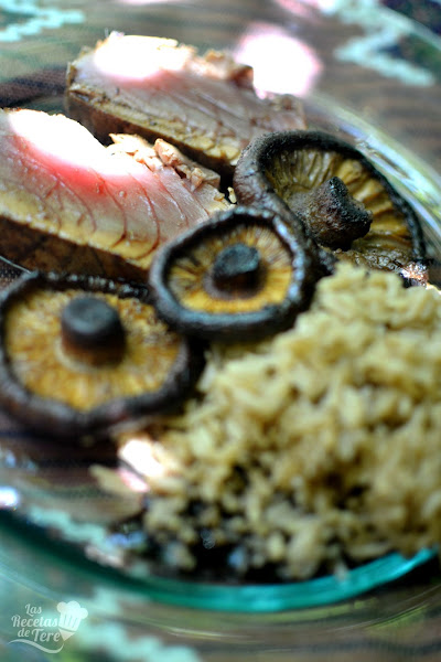 Enciende la plancha y cuando esté bien caliente pones a cocinar el lomo de atún y las setas que tienes reservadas, al lomo de atún le vas dando vueltas por todos sus lados hasta que vaya quedando dorado alrededor de todo el lomo, a las setas le das la vuelta dos veces por 2-3 minutos por lado, ahora ya puedes retirar de la plancha, el lomo de atún lo cortas, con un cuchillo bien afilado, en rodajas de unos 3 centímetros de grosor, debe quedar tostado por fuera y bien rojo por dentro, sirve acompañado del arroz y de las setas, toda una delicia ideal para el verano!!!