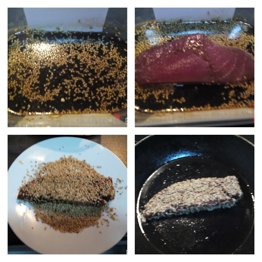 Mezcla en un recipiente la salsa de soja, el vinagre, una cucharada de azúcar, una cucharada de jengibre en polvo y un par de cucharadas de sésamo. Divide el lomo de atún en dos trozos, cortándolo a lo largo y macera durante 2 horas dentro de la mezcla de soja.