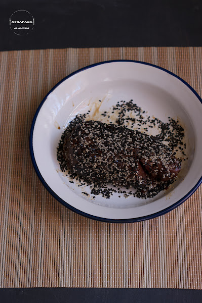 Una vez pasado el tiempo de maceración, preparamos en un plato una mezcla de sésamo blanco y negro. Rebozamos la pieza de atún. Y el líquido de maceración lo ponemos en un cazo y reducimos a fuego medio durante unos diez minutos.