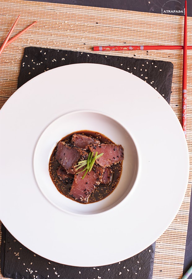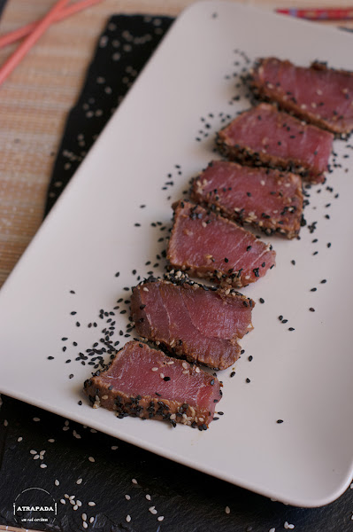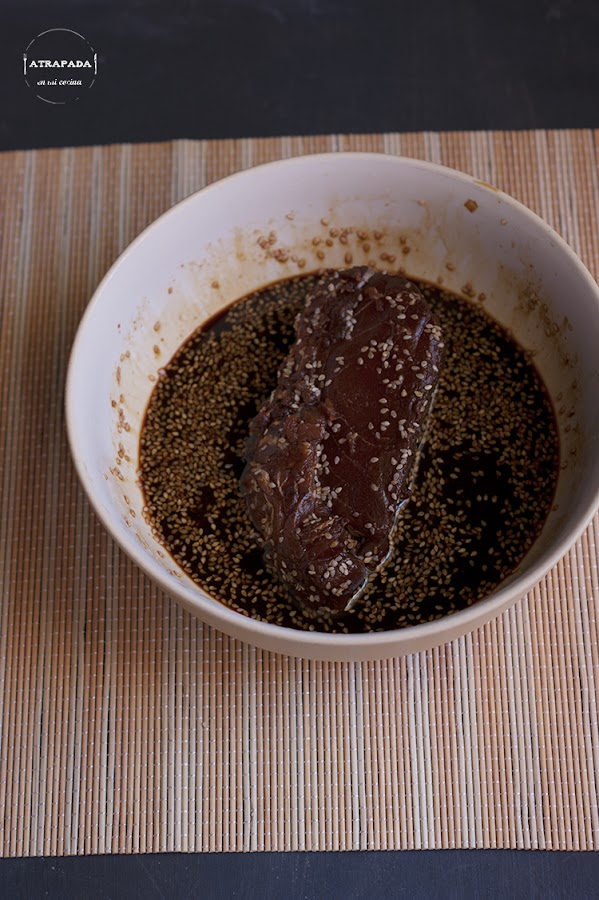 Compramos el atún fresco y lo congelamos durante al menos 24 horas para combatir una posible intoxicación por anisakis. Descongelamos después de este tiempo prudencial en el frigorífico y una vez totalmente descongelada la pieza procedemos a preparar el marinado de la receta. Mezclamos la salsa de soja, el vinagre de arroz, un poco de sésamo, el jengibre molido y el azúcar. Introducimos el trozo de atún y tapamos con papel film, introduciendo en el frigorífico, movemos la pieza varias veces para que quede bien impregnado la salsa durante el tiempo de maceración, que será de al menos dos horas.