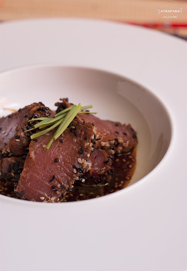 Cortamos en lonchichas finas el taco de atún y servimos acompañado de la reducción de la salsa, además podemos completar con pasta de wasabi.