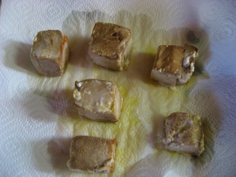 3º " Los sacamos y los secamos con un papel absorbente antes de pasarlos por la plancha, si tenéis, o como yo que soy de cocina pobre por la sartén, je.je.je. Solo vuelta y vuelta, la cuestión es hacerlos a fuego fuerte y solo darles un toque por cada lado ya que en su interior tienen que quedar casi crudo el Bonito. Vale que lo de crudo no os va mucho. Lo colocamos una vez pasados por la sartén un momento en microondas y ya lo tenemos cocido por dentro. Ya sabéis que casi todo tiene solución.