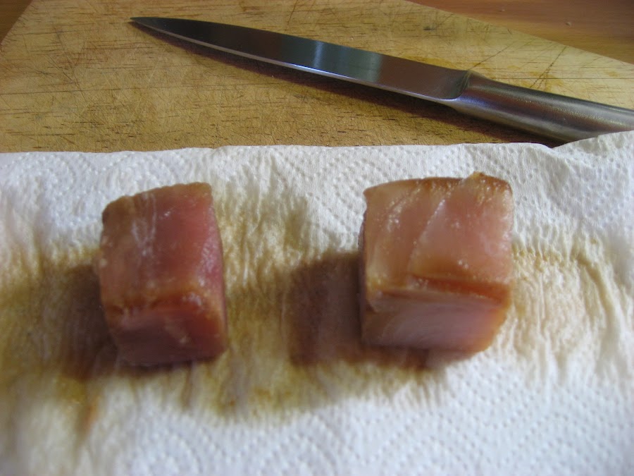 1º " Cortamos el Bonito en cuadrados, a poder ser lo más perfectos que podamos, de ello dependerá la presentación, que no así el gusto.