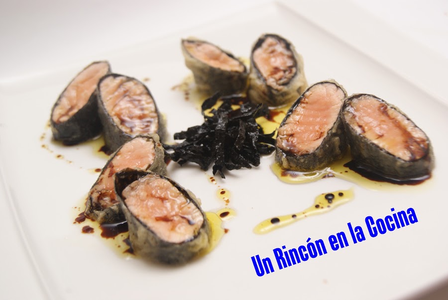 - Ponemos un poco de sal y enrollamos en el alga nori, presionando y cortando justo para dar solo una vuelta con el alga, para pegar bien el rollo humedecemos el borde y presionamos.