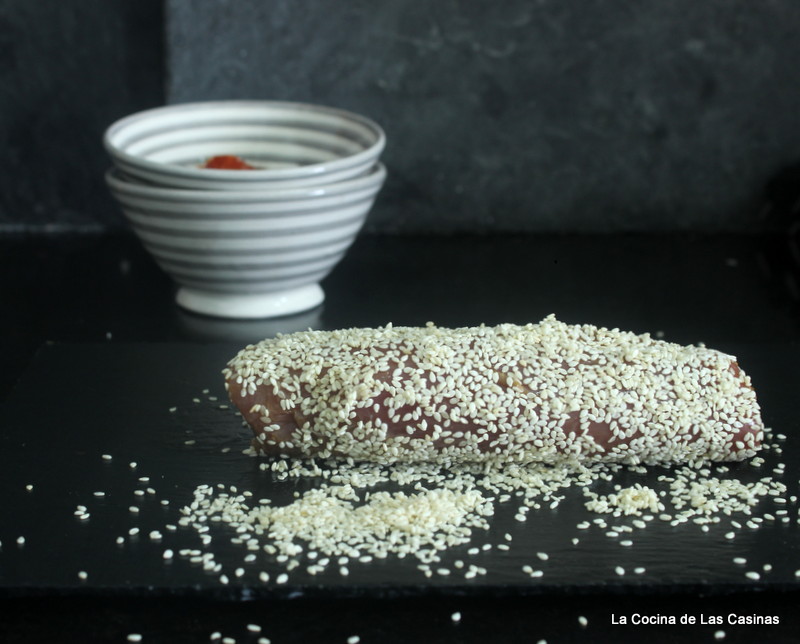 Debe macerar un par de horas, de vez en cuando dale la vuelta. Retira del líquido, seca con papel absorbente o cocina, extiende en la encimera las semillas de sésamo restantes y reboza la carne por todos los lados.