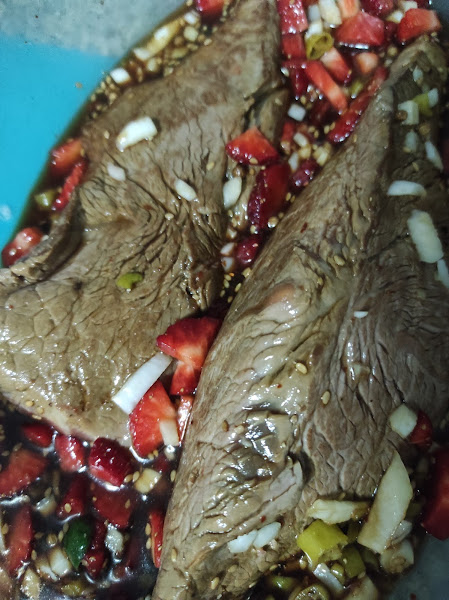 Colocamos la carne en un recipiente y la regamos con la mezcla anterior, si no la cubre, le iremos dando la vuelta.