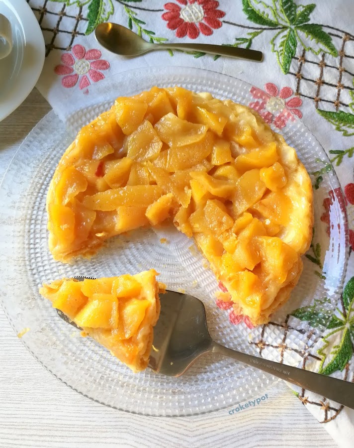 Es muy rápida de preparar y de hacer, en total podemos tardar menos de una hora si utilizamos la masa quebrada o el hojaldre ya preparado. Para el molde normalmente se hace en un molde de cristal pyrex para controlar la cocción de la manzana, pero en un molde desmontable con un poco de papel de hornear, nos da la posibilidad de poner más manzana. La receta es la del libro de Julia Child, solo que le añado la canela que me parece le da un sabor irresistible.