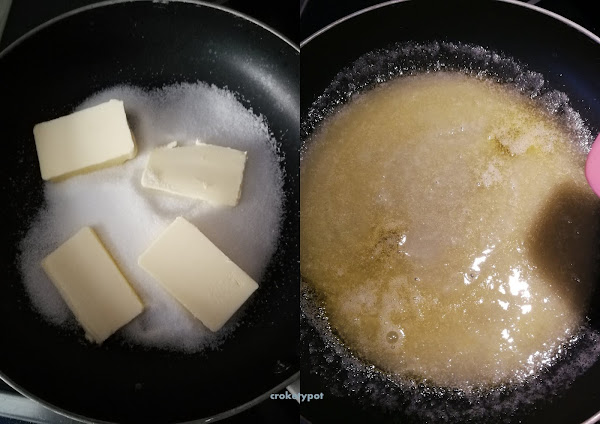 En una sartén o cazo, ponemos el azúcar con la mantequilla y lo ponemos a caramelizar.