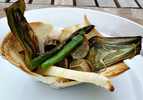 2 esparragos y dos láminas de alcachofa. Añadir unas hojas de hierbabuena.