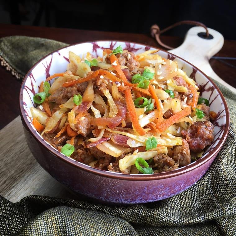 2. Vuelva a calentar la sartén. Añada el agua y raspe con una espátula los trozos marrones del fondo de la sartén. Reduzca el fuego a medio y agregue el repollo desmenuzado, las zanahorias, el ajo en polvo, el aceite de ajonjolí, el jengibre y las cebollas verdes. Sazone con sal y pimienta negra, a gusto, y cocine, revolviendo frecuentemente, hasta que el repollo se marchite y la zanahoria se ablande, aproximadamente 4-5 minutos.