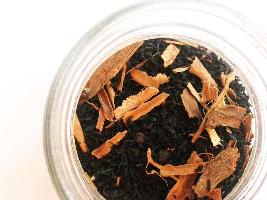 En un frasco de vidrio, añadir el té, luego las especias de a poco. En la medida que se agregan, cerrar el frasco y mover para que queden mezcladas con el té. Repetir esta operación con cada ingrediente.