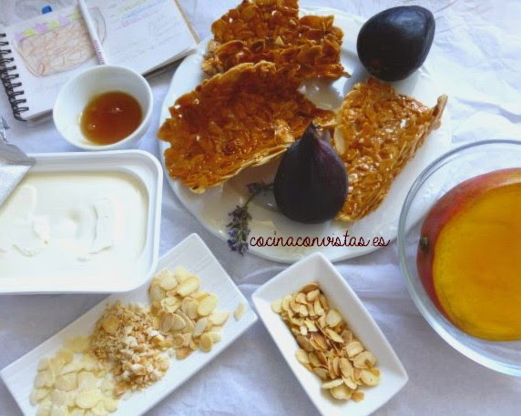 Montaje: En cada teja ponemos un par de cucharadas de la mezcla de queso, miel, frutas y almendras y decoramos con unos gajos de higos y unos corazones de mango.