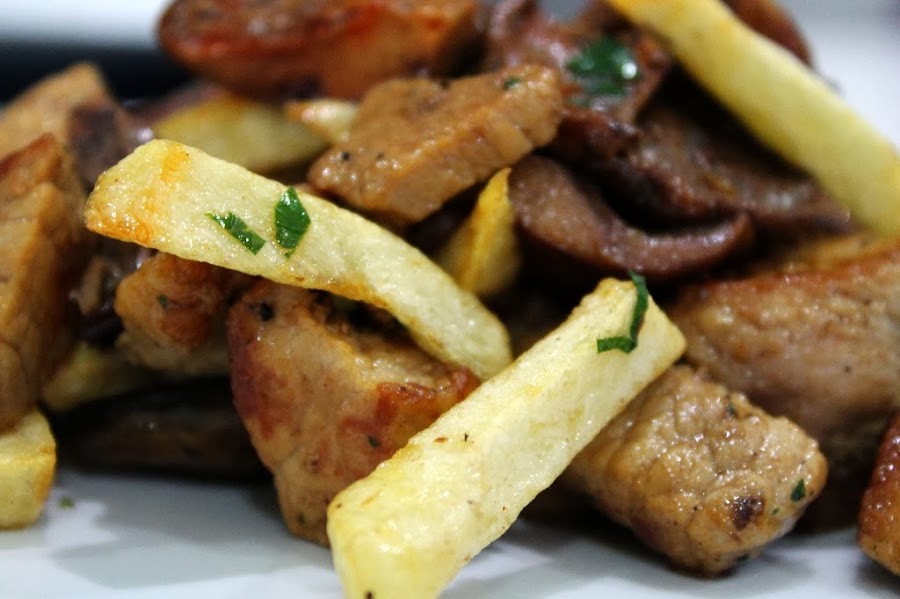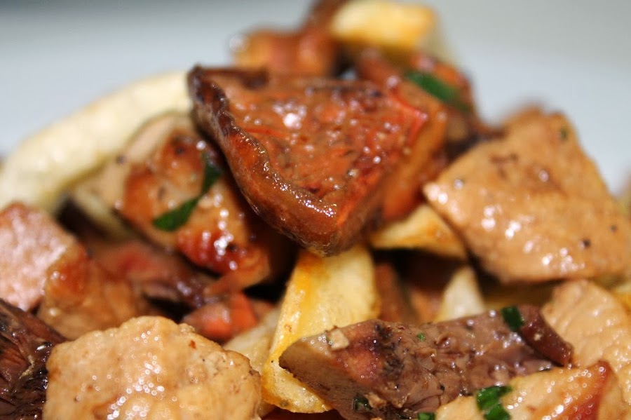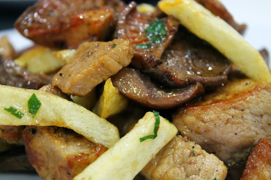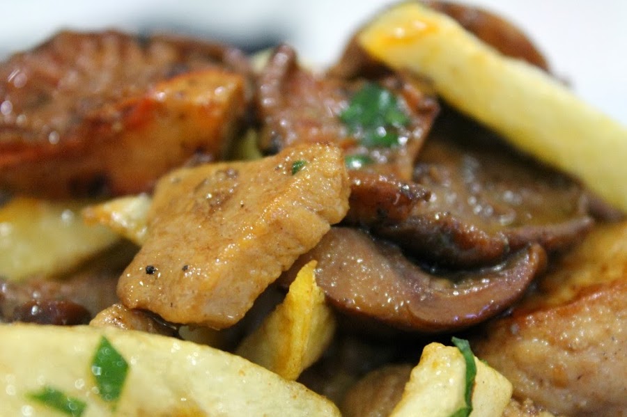 La de hoy es una receta con sabores mallorquines muy común en nuestra isla, una combinación de esclatasangs con lomo de cerdo, pero además le he añadido patatas y lo he convertido en una especie de frito, una muy buena manera de tomarse este plato tan completo. Espero que os guste. Bon profit.