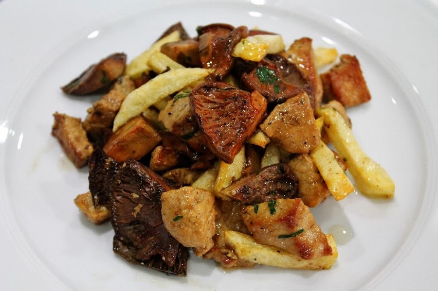 Una vez lo tengamos todo salteado y siempre en el momento de comerlo ponemos la cacerola donde tenemos el lomo, las setas y las patatas al fuego y lo mezclamos sin remover demasiado, simplemente para que se mezclen los sabores y se caliente bien, probar y poner bien de sal. Espolvorear con perejil picado.