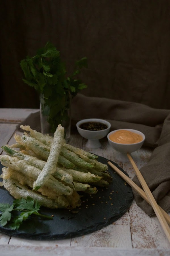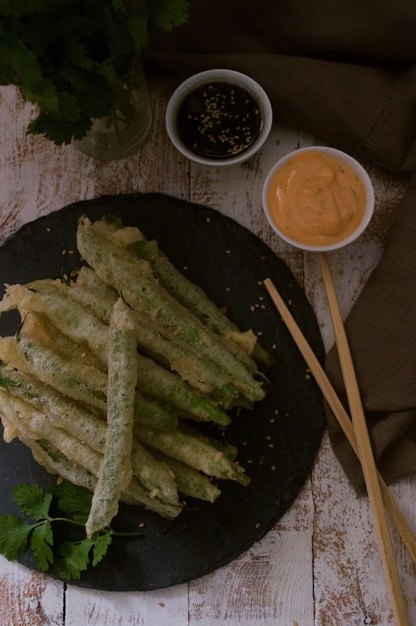 Lo que sí que tengo que decirte es que la cantidad de tempura que sale, para las judías verdes que pone la receta, sobra casi la mitad. Así que, puedes hacer más judías verdes, vainas, o puedes hacer la mitad de la masa. Yo te dejo las cantidades que yo he hecho y tú ya decides. La receta la he adaptado del blog Big flavors from a tiny kitchen.