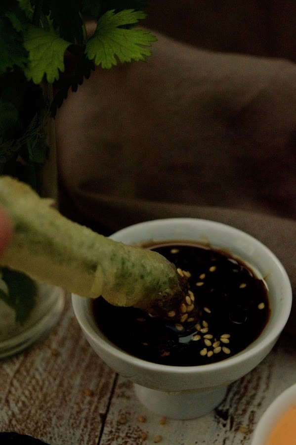 TEMPURA DE JUDÍAS VERDES CON SALSA SRIRACHA Y SOJA CON JENGIBRE