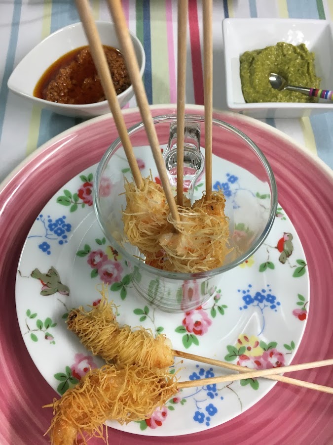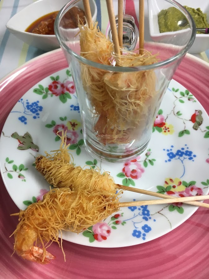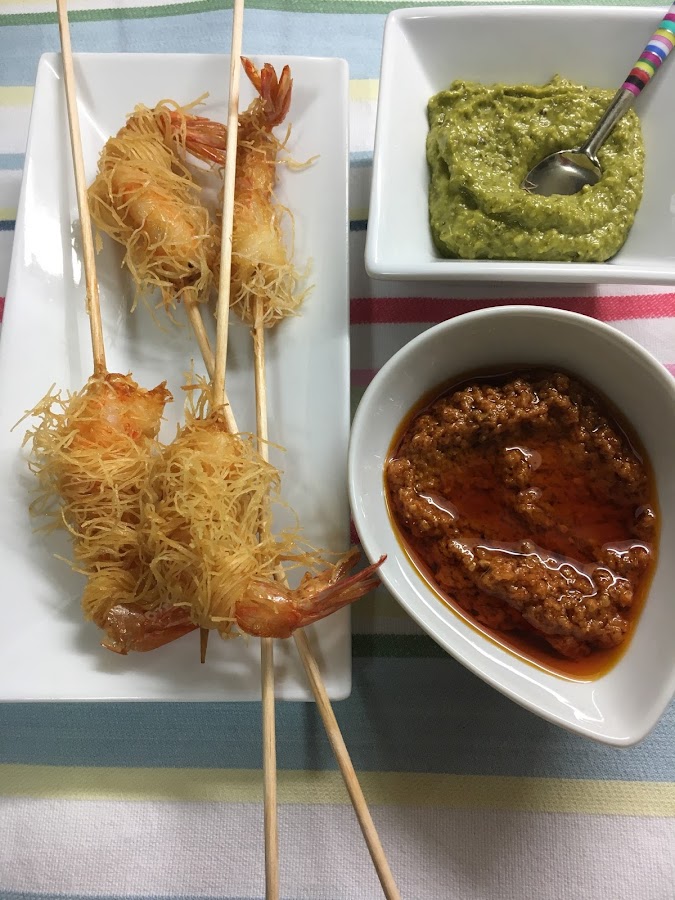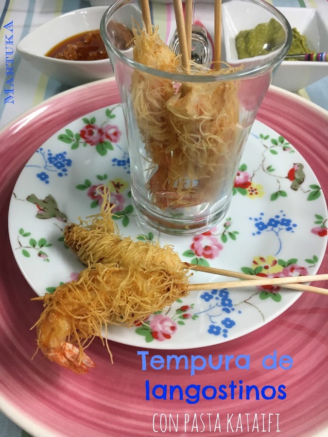 Había probado estas deliciosas brochetas de langostinos en un cóctel en el Hotel nH Príncipe de Vergara y en otros sitios de tapeo, pero no me había atrevido a hacerlas porque no busqué la pasta kataifi.