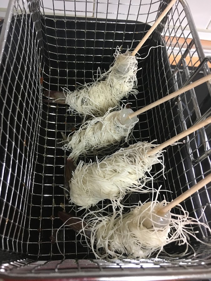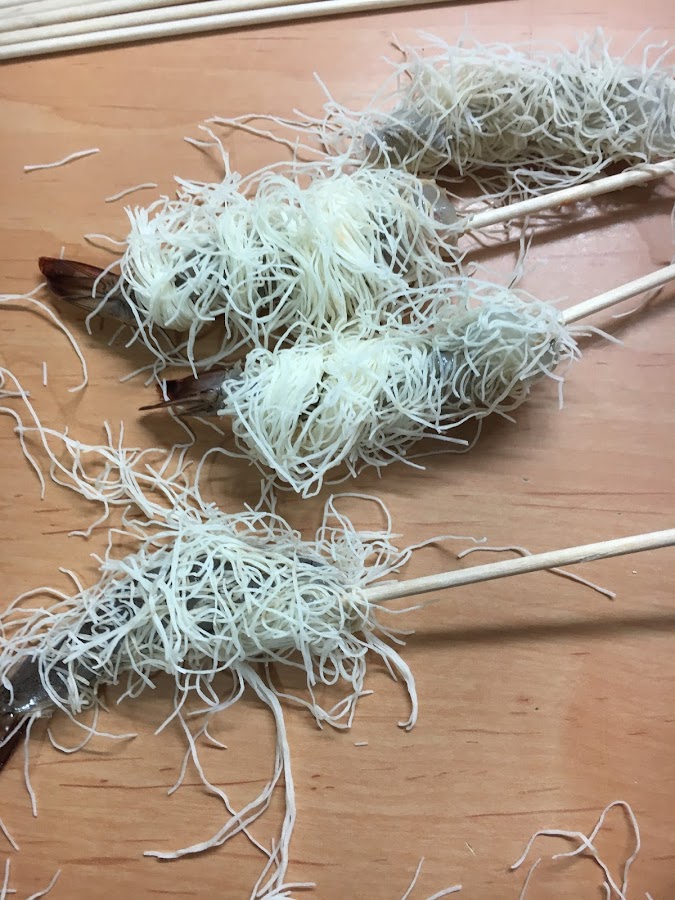 La fritura necesita sólo unos instantes para que los "fideos" de pasta se doren y queden crujientes. La elaboración de las brochetas es como hacer trabajos manuales, se cortan trozos de pasta y se enrollan alrededor del langostino. Unos quedan más bonitos, pero el sabor y el crujiente es el mismo.