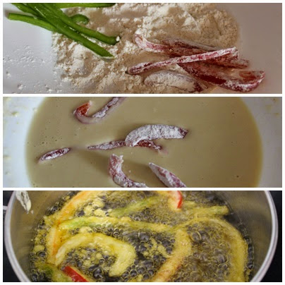 Rebozamos las verduras primero en el recipientes de la harina seca y luego en la masa ligera.