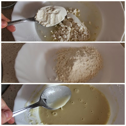 La proporción para hacer la masa es : 7 partes de agua y 3 de harina Yolanda. Yo he puesto para esta cantidad 7 cucharadas soperas de agua por 3 de harina.