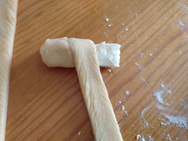Enrollamos el queso con las tiras que hemos cortado sin que quede ningún hueco sin masa para que el queso no se salga al freírlos.