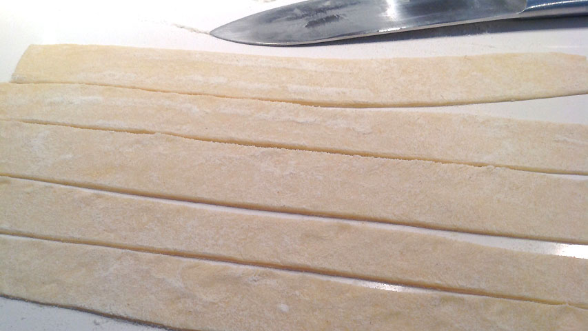Una vez "cuadrada" la masa se corta en tiras más o menos del mismo ancho.