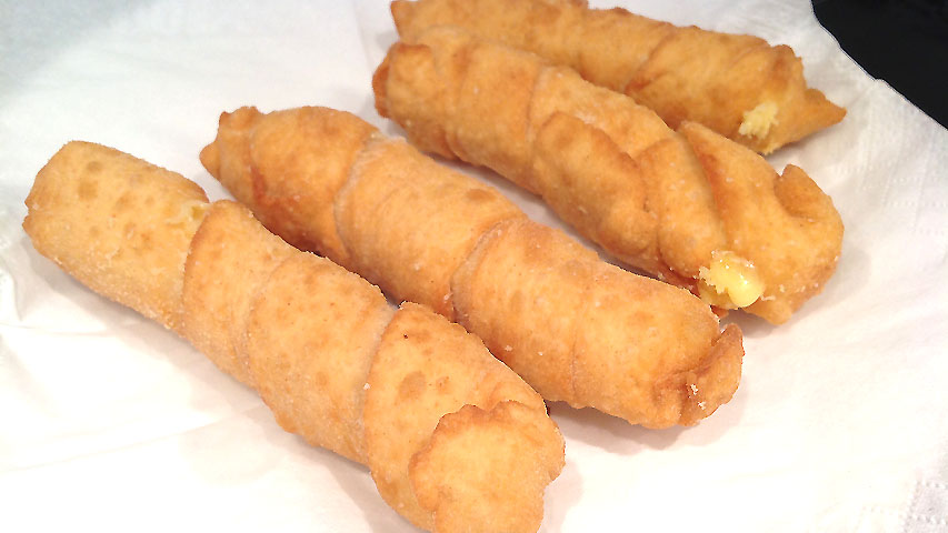 Envuelve las barritas de queso con la masa y cierra bien para que no se salga el queso al freír.