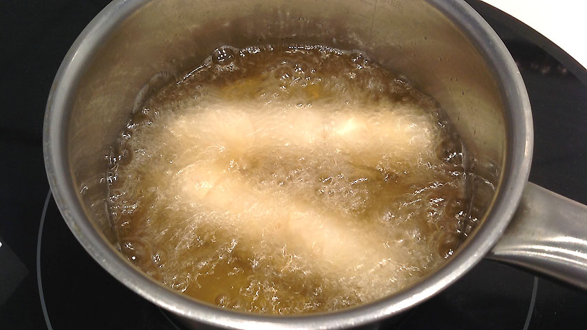 Sumergidos en aceite de girasol a fuego medio-alto (7/10) los tequeños se hacen en 2-3 minutos.