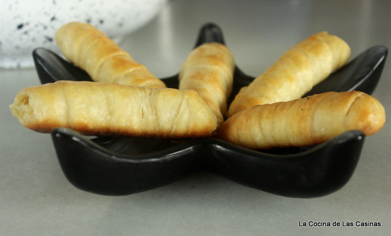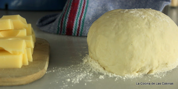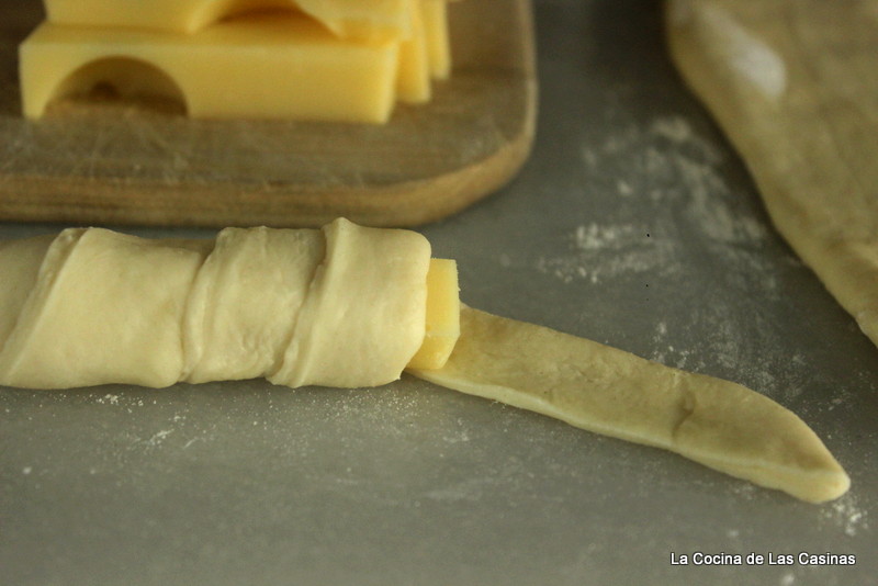 Mientras tanto corta en palitos el queso. Espolvorea con harina la encimera y extiende la masa con el rodillo. Corta tiras y cubre cada palito de queso. Tendrás que tener cuidado que no quede ningún sitio sin cubrir ya que se te saldrá el queso, como me ha pasado a mí en algunos jajaja.