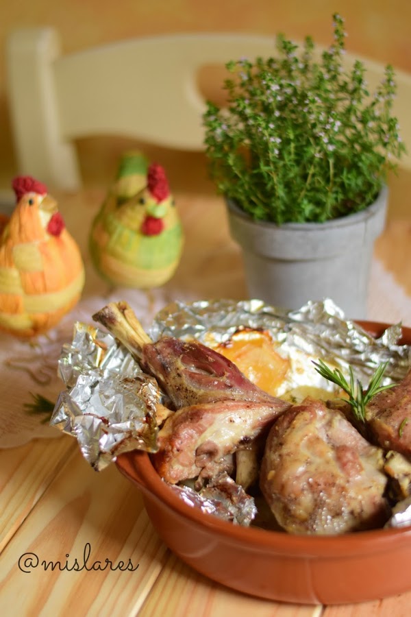 5. Colocamos encima el ternasco, cerramos bien el paquete de papel aluminio y metemos en el horno precalentado a 200º 1 hora y media mas o menos.