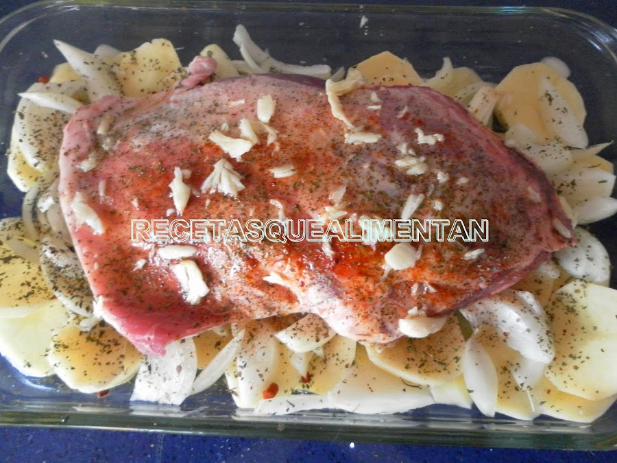 Machacamos los dientes de ajo en un mortero y los mezclamos en un bol con el aceite de oliva, lo vertemos encima de la carne y las patatas repartiéndolo bien por todos los ingredientes.