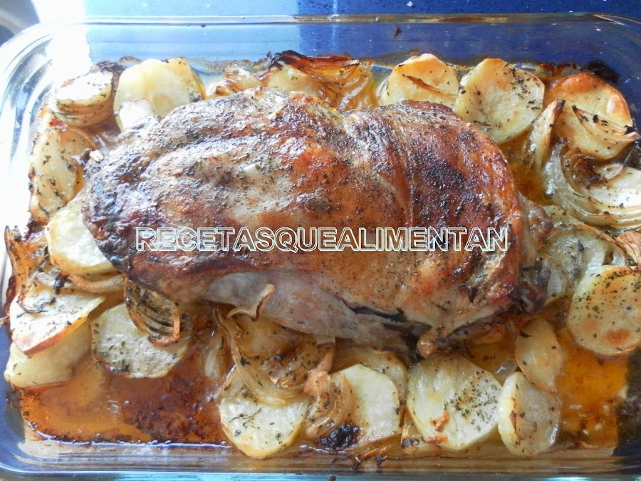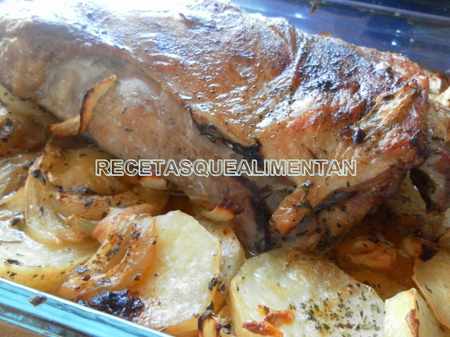 Pasados 30 minutos o cuando la carne esté tostada, retiramos del horno y le damos la vuelta al ternasco, removemos un poco las patatas para que no se peguen, con cuidado de no romperlas y vertemos encima de patatas y ternasco un poco de la salsa.