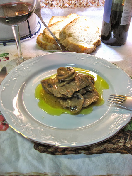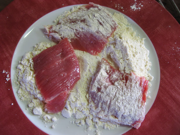 4º " En un plato colocamos un poco de harina y pasamos los filetes cortados, los pasamos por la sartén y los vamos colocando en la cazuela junto a la cebolla y los champiñones.