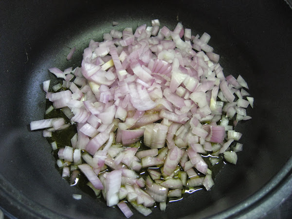 1º " Cortamos la cebolla y la ponemos en una cazuela baja a freír, no tiene que quedar muy dorada, solo por los bordes.