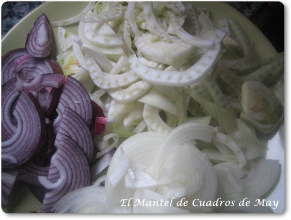 Limpias las cebollas y el hinojo, quitando la parte dura, del hinojo quitas la primera capa y de la cebolleta guardas parte del tallo verde.