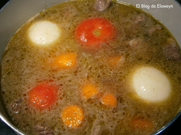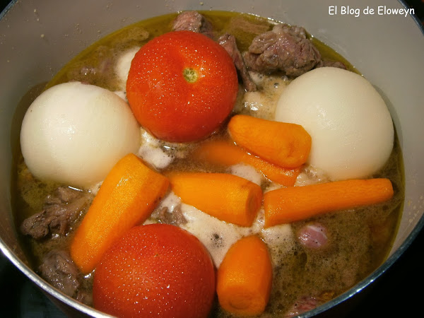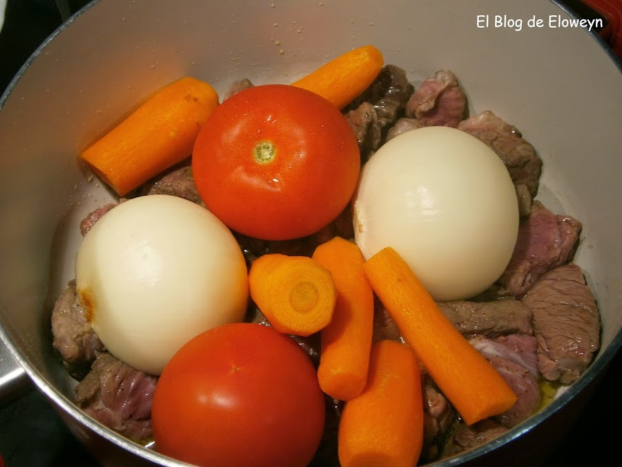 Remover hasta que comience a dorarse. Añadir la cebolla entera, el tomate entero y las zahahorias partidas en dos (Ojo, que también tenemos unas zanahorias pequeñas o cortadas en trocitos que no debemos de poner todavía). Por cierto, yo partí por la mitad la cebolla, porque era ENOOORMEEE!!!! jajaja