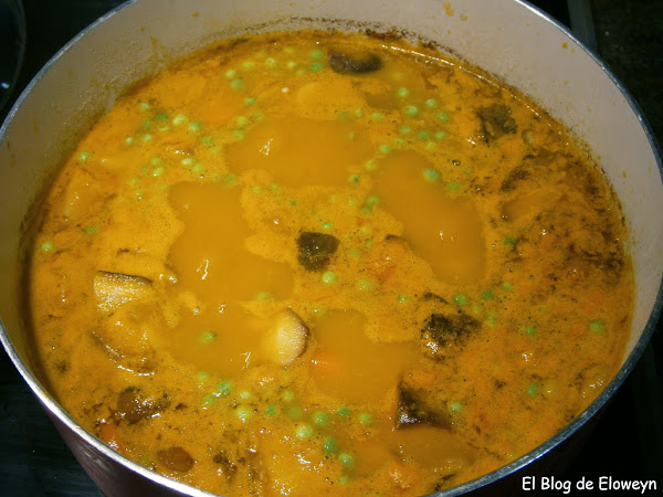 Ponemos las verduras trituradas otra vez en la cazuela y echamos las zanahorias pequeñas o cortadas a trocitos que teníamos reservadas y las setas. Hervir unos 15 minutos y poner los guisantes.