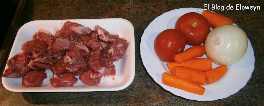 Salpimentar la ternera, pelamos la cebolla y las zanahorias y lavamos los tomates.