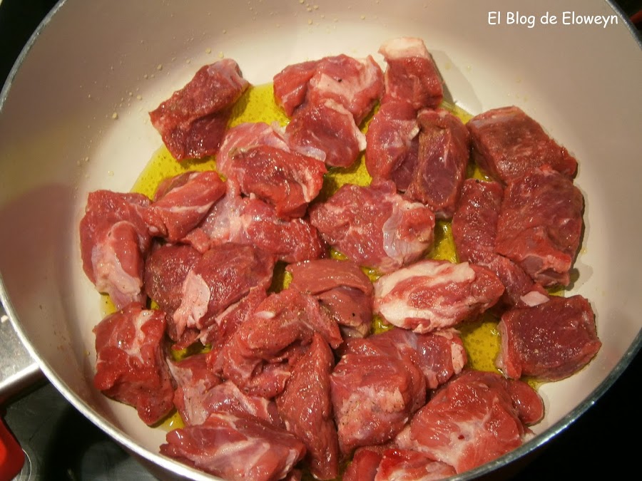 Poner una cazuela al fuego con un poco de aceite. El fuego tiene que estar muy fuerte al principio para que la ternera suelte todo el agua. Cuando el aceite esté caliente, ponemos la ternera.