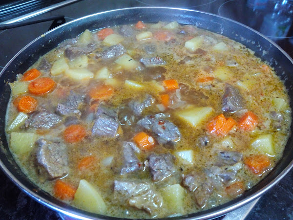 Entonces, cubrimos bien de agua y subimos el fuego para que hierva. Espolvoreamos con tomillo y una cucharadita de pimentón.En cuanto rompa a hervir, ponemos a fuego medio y mantenemos hasta que la carne y las patatas estén bien hechas. Aproximadamente unos cincuenta minutos.