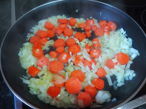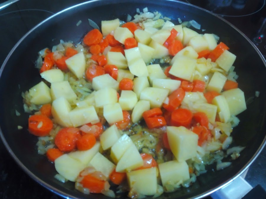 Cuando la cebolla esté dorada, añadimos la zanahoria cortada en rodajas y mantenemos a fuego medio-bajo mientras pelamos y cortamos las patatas. En cuanto las tengamos, las añadimos al sofrito.