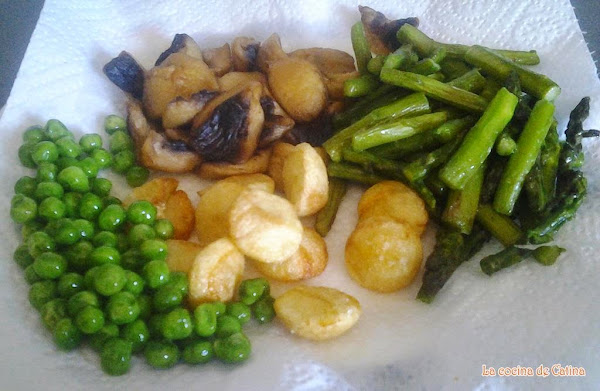 A continuación freímos las bolitas de patatas, reservamos y en el mismo aceite freímos los guisantes.