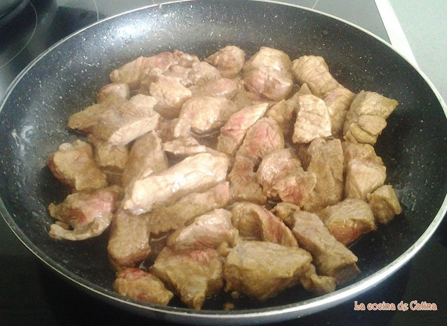 Añadimos la carne salpimentada que la habremos sofrito en otra sartén.