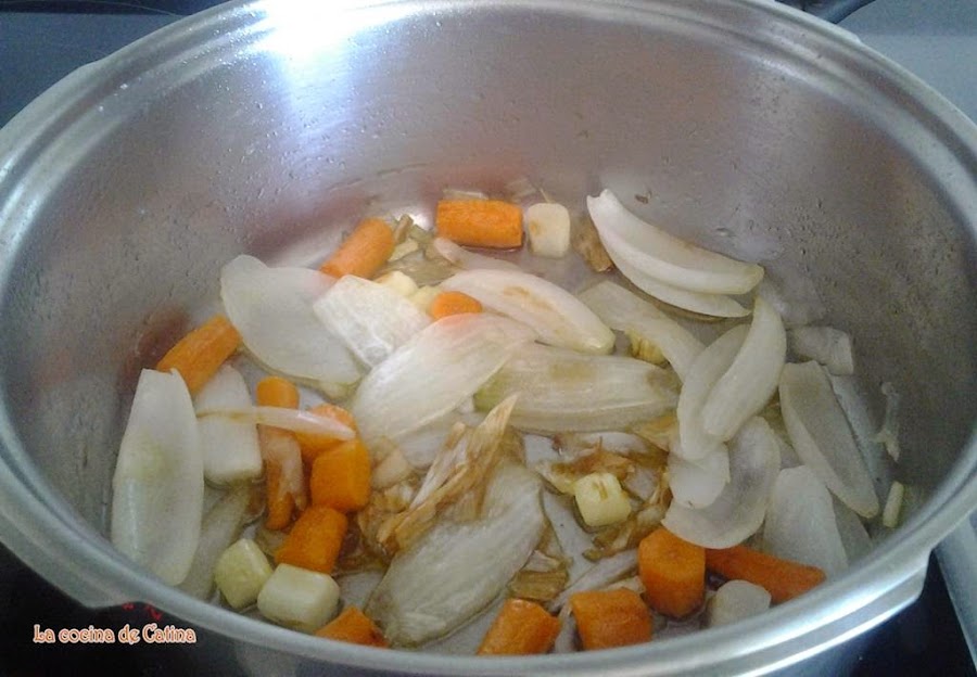 Ponemos una cazuela al fuego con 4 o 5 cucharadas de aceite. Ponemos a pochar las verduras hasta que estén caramelizadas,