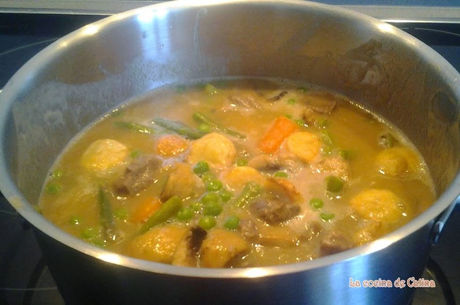 Una vez que la carne está hecha le añadimos todas las verduras, rectificamos de sal y si es necesario le añadimos un poquito de agua. Dejamos hervir durante unos minutos para que mezclen los sabores.