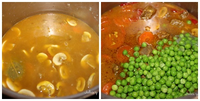 Destapamos la olla y añadimos los guisantes, dejamos cocer destapado hasta que estén tiernos tanto la carne como los guisantes.